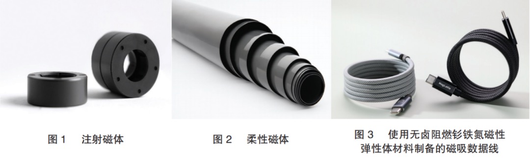 以钐铁氮注射磁体为例,使用宁夏君磁新材料科技有限公司生产的MGC12系列钐铁氮颗粒料,所生产的Halbach正弦四极充磁环形磁体在φ11.3 × φ5 × 11.6 mm尺寸下,可达到2900Gs的表面磁通密度;以各向异性钐铁氮磁性材料生产的无卤阻燃磁吸数据线Gs的表面磁通密度,并保证良好的柔韧性。
