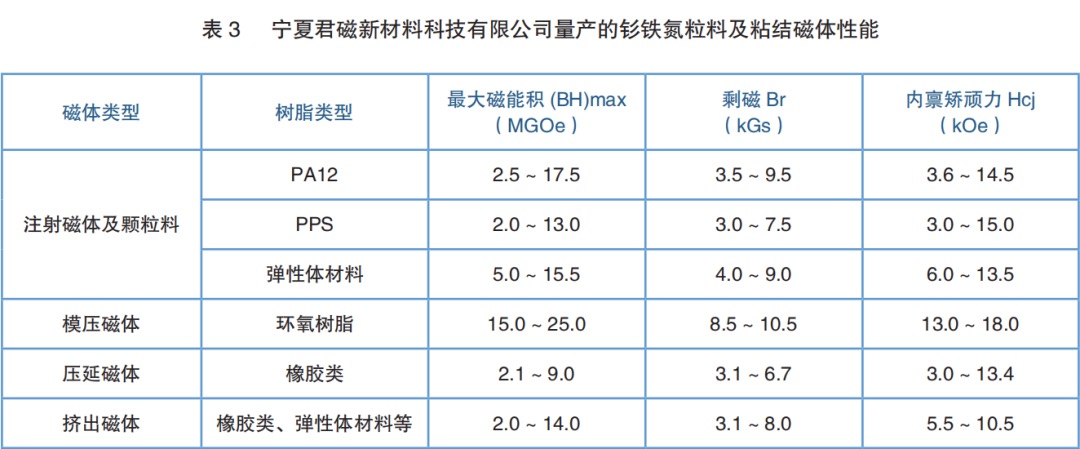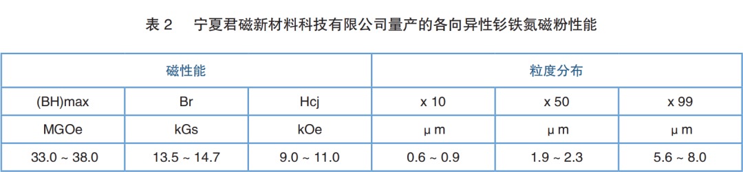 2021年日本粘结磁体协会(JABM)发布报告,介绍了目前全球具有独立知识产权和量产能力的各向异性钐铁氮生产企业的产品性能特征,该报告由入山恭彦先生完成,并有相关文献在国外行业权威刊物发表,具体见表1。