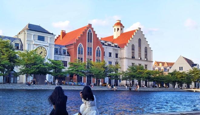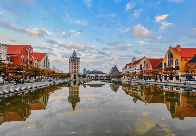 小镇中央的水池设计的非常好,红、白、蓝三个主基调的欧式建筑在蓝天白云下“神采奕奕”,不仅可以轻松拍到绝美的倒影,还可以静在水边的条形座椅上,一边享受夏风的轻浮与流水的欢唱,一边悠闲的体验这份安静而恬淡的午后时光。
