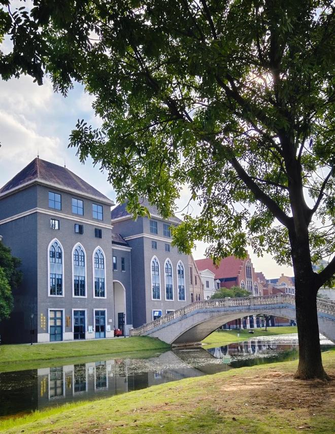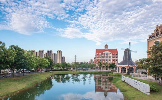 当我们漫步走进园区,首先映入眼帘的是一排城堡式的建筑,穿过横跨环城水系的廊桥,被一片白墙红瓦的建筑包围。举目四望,漂亮的风车、下沉广场、市政厅、灯塔等极具特色的建筑群环绕四周,带给我们非常强烈的视觉冲击,感觉仿佛真的置身于欧洲的某个小镇中,太美了。