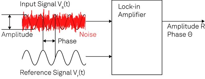 图 1. 锁相放大器可对照一个固定的参考信号,测量出待测信号的幅值和相位,即使该信号已经完全被噪声掩盖。