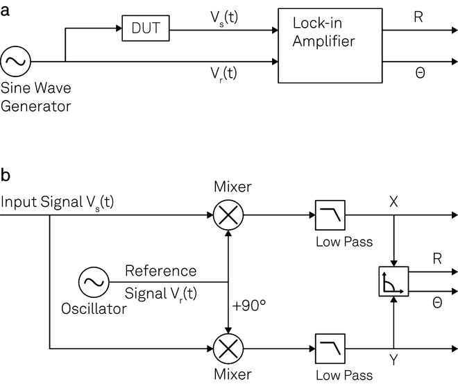 图 2. (a) 典型锁相测量过程的示意图。使用正弦信号来驱动被测设备(DUT),并将其作为参考信号用于后续测量。锁相放大器将对被测设备的响应进行分析,并对照参考信号,输出目标信号的幅值和相位。(b) 锁相放大过程的示意图:输入信号分别与参考信号及其90度相移信号相乘。混频器输出经低通滤波后,将滤除噪声和2ω分量,并最终转化为极坐标。