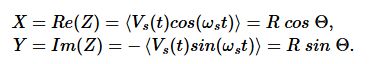 解调信号Z(t)的实部和虚部分别为同相分量X和正交分量Y。这两个分量可通过欧拉公式exp(iωst)≡cos(ωst)+i sin(ωst)计算得出: