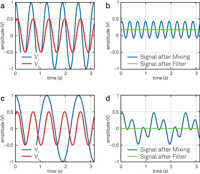 图 4. (a)最大幅值为0.5 V的输入信号Vs(红色)与同频参考信号Vr(蓝色)相乘。(b)得出的信号带有一个直流偏移量和两倍于Vs和Vr频率的频率分量。直流偏移量的值为0.17 V,即输入信号的同相分量X。(c)输入信号Vs与不同频率的参考信号Vr相乘。(d)得出的信号带有两个频率分量fs-fr和fs+fr。信号的平均值始终为零。