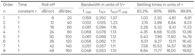 表 1. 具有相同时间常数的n阶RC滤波器的滤波特性。动态应用通常关注f−3dB和稳定时间,而在噪声测量中,确保fNEP正确则是获得准确结果的关键。通过上文给出的关系式,可以轻松计算出具有相同带宽但阶数不同的滤波器的滤波时间常数。