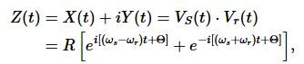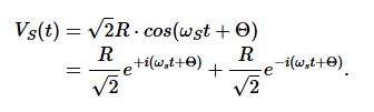 我们可以将输入信号Vs(t)重新表示为复平面上两个矢量之和,这两个矢量的长度均为R/√2,以相同角速度ωs旋转,但一个顺时针旋转,另一个逆时针旋转: