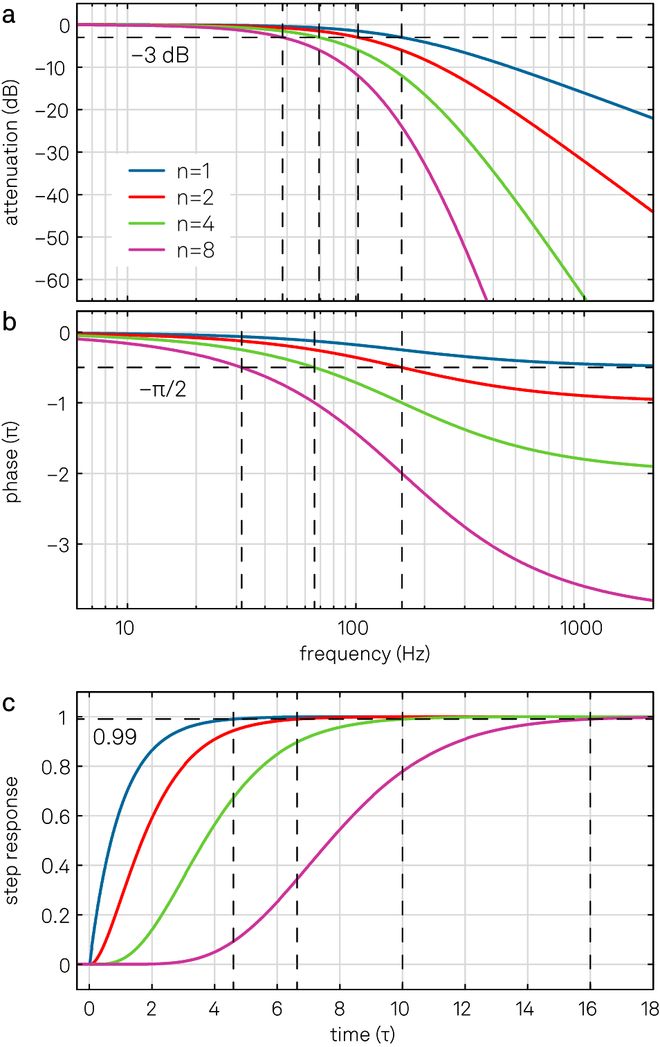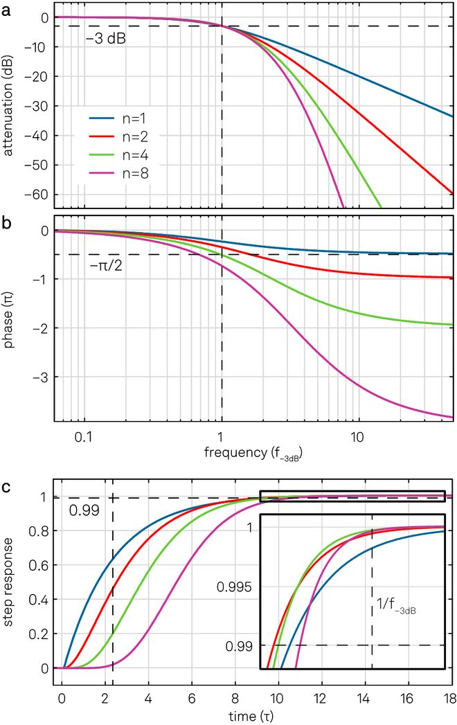 图7. (a) 和 (b) 中的蓝线是RC滤波器传递函数H(ω)的波特图。图上还绘出了具有相同滤波器时间常数τ 的高阶滤波器(n=2,4,8)的传递函数,显然,高阶滤波器的信号带宽f−3dB要低得多。(c) 为时域中对应的阶跃响应函数。将多个滤波器级联会导致达到相同精度水平所需的稳定时间显著增加。这与相位延迟的增大(可以根据 (b) 推断得出)有关。级联RC滤波器或积分滤波器的另一个优点是在时域中不会出现过冲,而这是巴特沃斯滤波器等类型的滤波器存在的问题。