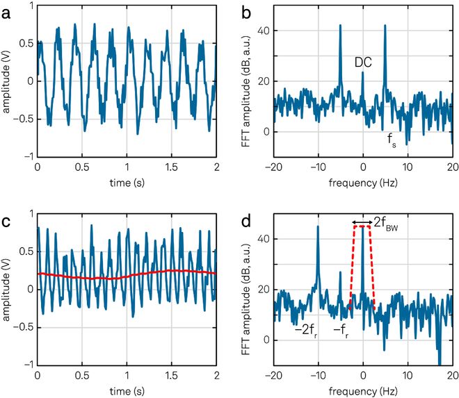 图 5. 解调前后信号时域图与频域图之间的关系。(a) 叠加了噪声的正弦输入信号与时间的关系。(b) (a)中的信号在频域中的表示。(c) 与参考信号混频(蓝线)并经过低通滤波(红线)后,fBW内的信号频谱得以保留。(d) 在频域中,混频过程将频率分量平移-fr。随后,滤波器以零点为中心提取宽度为fBW的窄带。请注意频率-fr处的分量,它是由输入信号中存在的偏移量和1/f噪声产生的。要获得准确的测量值,必须通过适当的滤波来抑制此分量。