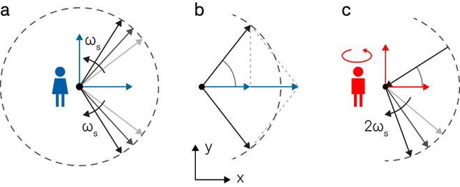 图 3. 在复平面中表示的解调过程。(a) 输入信号Vs(t)可表示为两个旋转方向相反的矢量之和。(b) 矢量在实轴x轴上的投影彼此叠加,而在虚轴y轴上的投影则相互抵消。(c) 在旋转坐标系中,逆时针方向的矢量保持静止,顺时针方向的矢量以观察者角速度的两倍旋转。请注意,依照惯例,如果逆时针旋转的矢量在参考信号之前,则θ为正值。