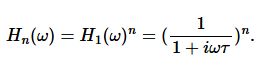 相比理想化的矩形滤波器,一阶滤波器的滚降特性相对较差。为了改善滚降特性,通常会将多个滤波器级联。每增加一个滤波器,滤波器阶数会增加1阶。前一个滤波器的输出将作为下一个滤波器的输入,因此我们只需将滤波器的传递函数相乘即可。根据式9,我们可以得到n阶滤波器的传递函数如下: