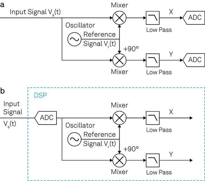 图 13. (a) 模拟锁相放大器:信号被拆分成两路,与参考信号混频,经滤波后转换为数字信号。(b) 数字锁相放大器:信号经数字化后与参考信号相乘并进行滤波。