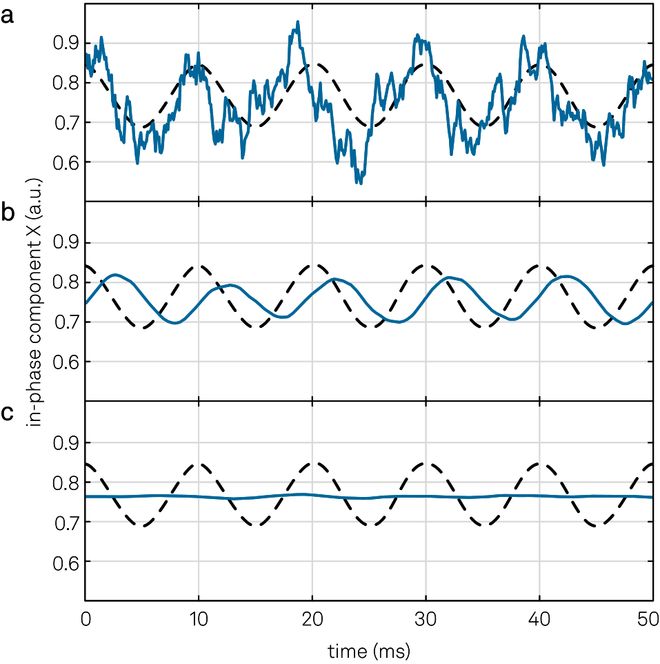 图 11. (a) 输入信号带噪声时,生成的解调信号也将带有噪声(蓝线)。黑色虚线表示的是去除噪声后的底层信号。(b) 使用带宽f−3dB=fm=100 Hz的滤波器可以滤除大部分噪声,但会影响检测到的信号。(c) 同(b),但使用的是带宽f−3dB=fm/5=20 Hz的滤波器。