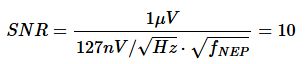 为了更定量化地进行说明,我们假设要测量一个幅值为1μV的正弦信号,该信号通过一个1MΩ电阻,信噪比大于10。这样的电阻R会产生热噪声,功率谱密度=4kBTR,在室温 T=300 K时,该值约为