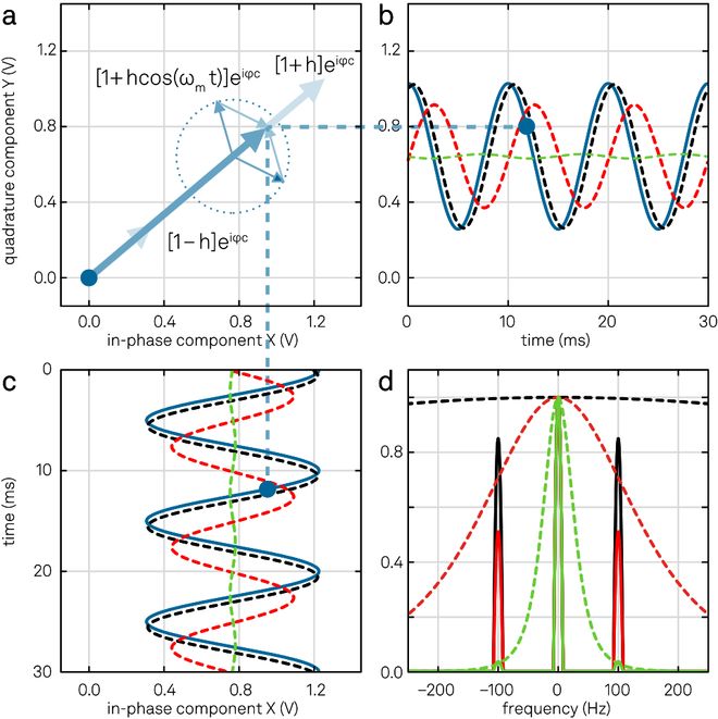 图 10. (a) 在旋转参考系中,调幅信号是一个长度随时间变化的矢量。蓝色粗箭头表示瞬时信号;细箭头表示调幅信号的两个边带。(b) 和 (c) 显示了解调输入信号的正交分量和同相分量:蓝线为未滤波信号,黑色虚线、红色和青色线 Hz的已滤波信号。(d) 显示了三种不同带宽滤波后的解调信号频谱(黑色、红色和青色曲线)。