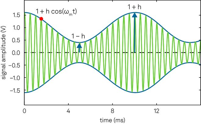 按调制频率fm=ωm/2π,将信号幅值R(t)=1+h cos(ωmt)(图9中的蓝线上下进行调制,其中调制指数h表示调制强度。在此示例中,载波频率和调制频率分别设为fc=2 kHz和fm=100 Hz。
