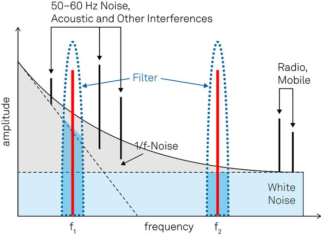 从图12的定性频谱可以看出,不同噪声源具有不同的频率依赖性:约翰逊噪声在所有具实用价值的频率范围内都呈现平坦的频谱,构成了“白噪声”,而闪烁噪声则具有1/f的频率相关性(“粉红噪声”)。如果在调制频率的选择上有一定的自由度,则可以重点关注频谱中噪声水平最低的部分。通常,频谱中表现出白噪声特性的较高频率区域效果最理想。图12展示了这种思路:在频率较低的1/f噪声区域,滤波器内的噪声(由蓝色和灰域表示)更大。因此,在滤波器带宽相同时,f2处的信噪比要高于f1处的信噪比,原因在于前者的噪声密度更低(前提是避开了无线电和无线传输等其他噪声源)。
