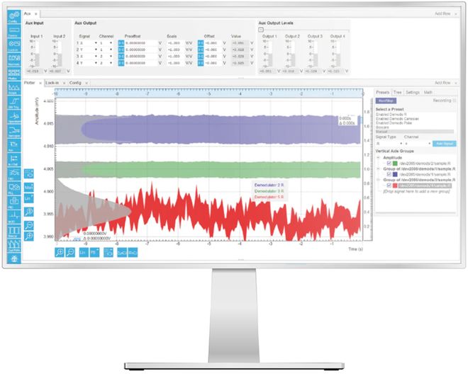 显然,图16中展示的丰富功能是无法通过前面板上的几个旋钮和按钮进行使用和控制的。因此,瑞士苏黎世仪器的所有锁相放大器均完全由计算机上运行的LabOne®软件来控制,该软件提供了如图15所示的图形用户界面,可以在任何安装了Web浏览器的设备上运行。参数扫描仪、数据采集模块(DAQ)和PID参数智能设定等高级工具都可以充分利用主机的处理能力,提高工作流程的效率。此外,LabOne还提供了针对Python、C、MATLAB®、LabVIEW™ 和编程接口,用户可以轻松将测量仪器集成到现有的实验控制环境中。