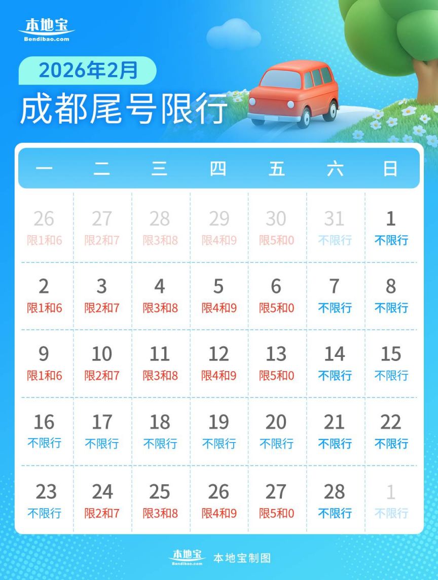 2026成都2月限行图来啦,注意2月有9天春节假期,这9天假期是不限行的哦,另外周六周天也不限行。